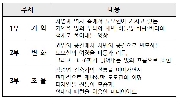 ❍ 내 용 : 도모헌의 기억·변화·조율을 주제로 건물 외벽에 영상 작품 전시,