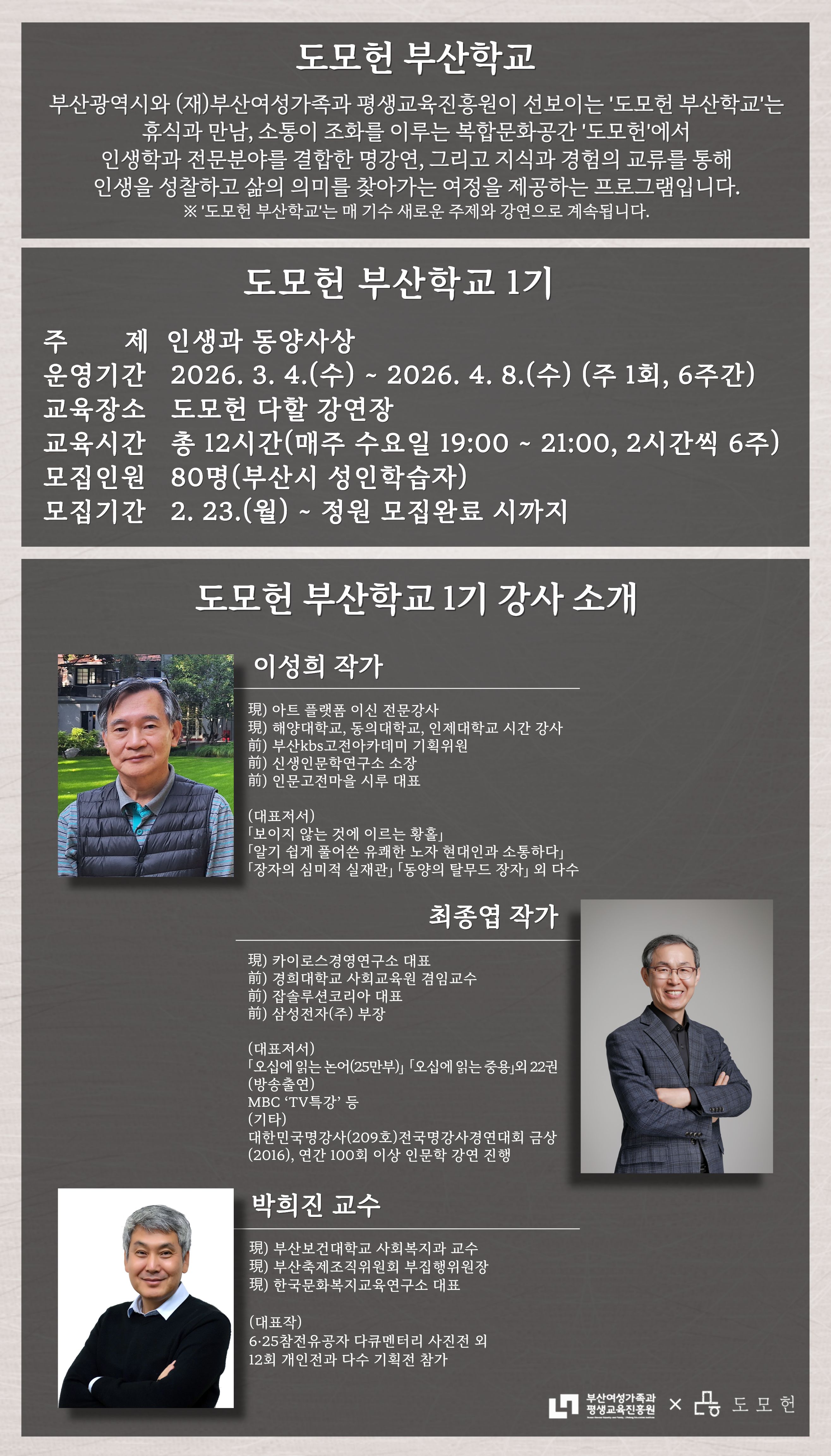 [도모헌 부산학교 2026-1기(인생과 동양사상) 과정 운영 안내]